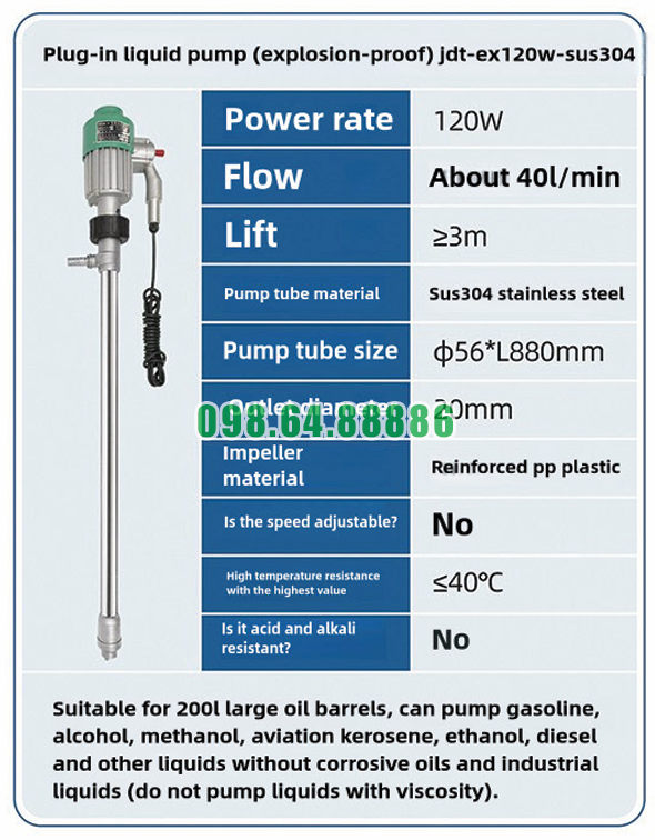 Tốc độ dòng chảy ổn định của Bơm chất lỏng cắm điện chống cháy nổ JDT-EX120W-SUS304 khi hoạt động còn nhờ thân inox 304 cứng cáp, giúp giảm rung động và giữ cho dòng chảy luôn ổn định.