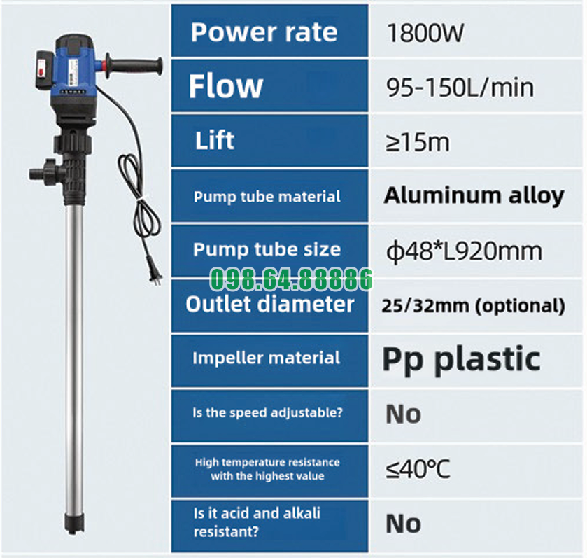 Khả năng chống ăn mòn hóa chất là ưu điểm của bơm điện thùng phuy cao cấp JDT-1800W-L92