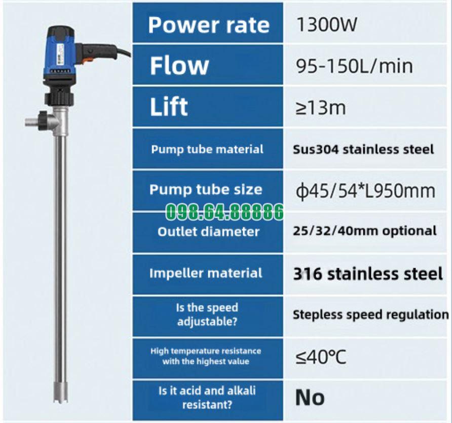 Trong thực tế sản xuất, bơm thùng phuy thường phải làm việc với nhiều loại chất lỏng có tính chất khác nhau như độ nhớt, tính ăn mòn hay mức độ bay hơi. Cách Bơm điện thùng phuy JDT-1300W-304SUS xử lý các loại chất lỏng khác nhau thể hiện rõ tính linh hoạt và khả năng thích ứng của thiết bị trong nhiều môi trường sử dụng.