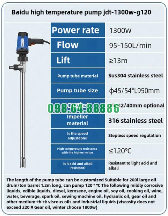 Với bơm thùng phuy nhiệt độ cao JDT-1300W-G120, động cơ 1300W đủ mạnh để xử lý dầu nóng, nhựa đường lỏng hoặc dung dịch gia nhiệt, nhưng vẫn cần vận hành trong giới hạn thiết kế để tránh quá tải.