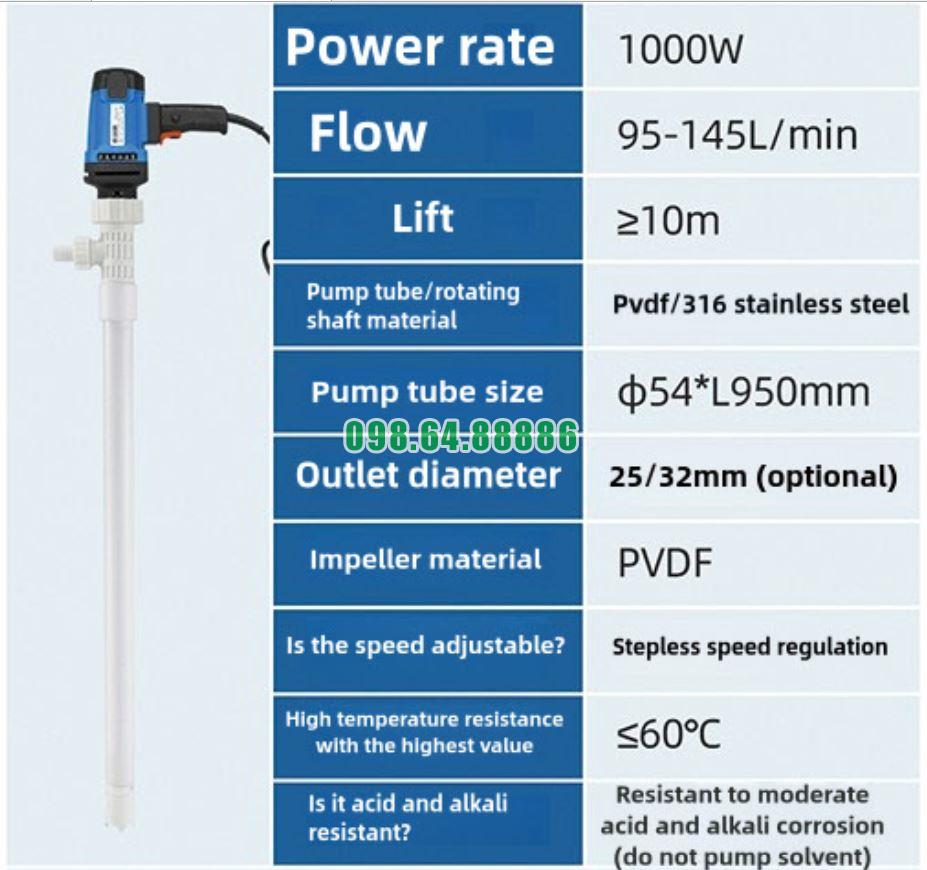Bơm JDT-1000W-PVDF sử dụng motor điện công suất lớn, tạo lưulượng mạnh và ổn định, vượt xa máy bơm tay vốn phụ thuộc vào sức người.