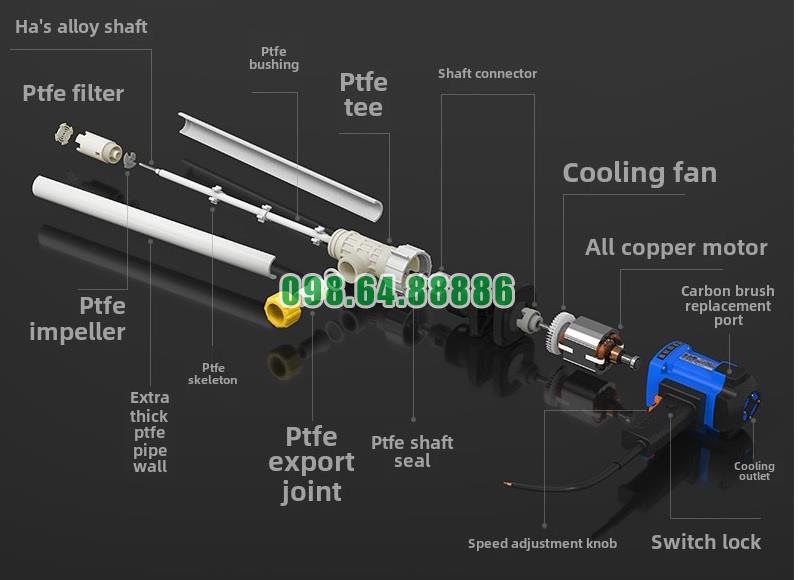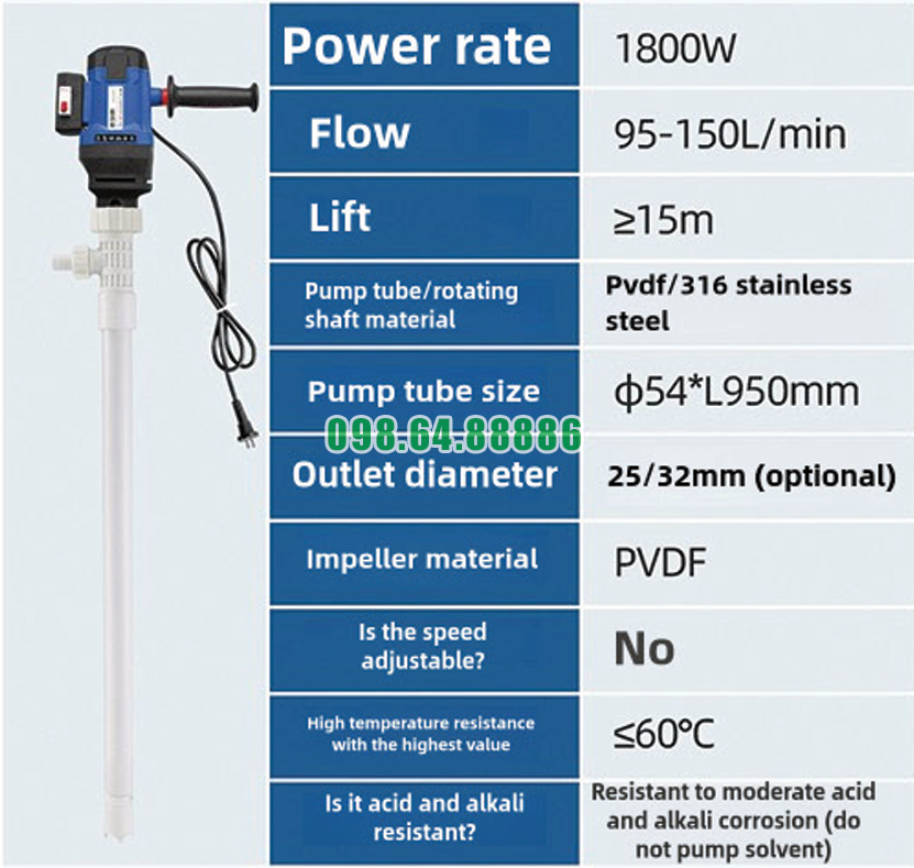 Một điểm nổi bật của Máy bơm điện chất lỏng cắm điện JDT-1800W-PVDF là sử dụng vật liệu PVDF cho ống bơm và cánh bơm.