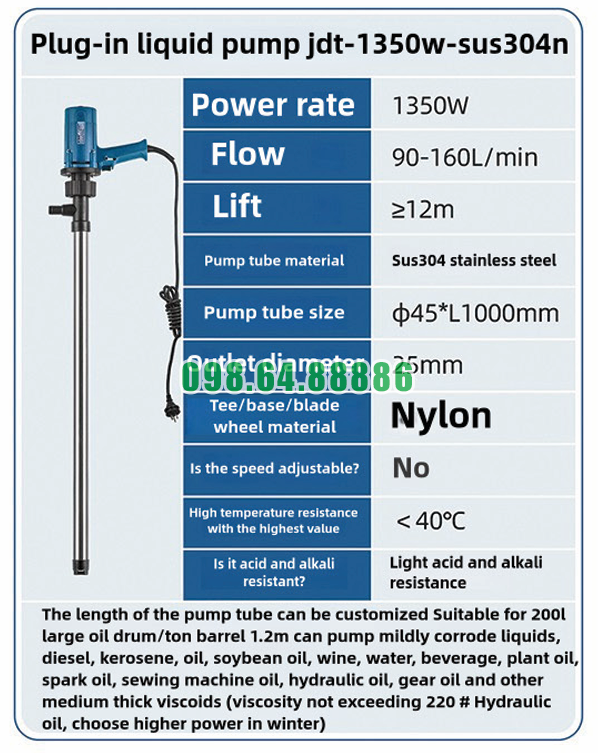 Máy bơm JDT-1350W-SUS304N được thiết kế để có thể bơm chất lỏng từ các thùng phuy có chiều cao khác nhau, và đầu ra của máy có thể dễ dàng điều chỉnh để phù hợp với nhiều môi trường làm việc khác nhau. Tính linh hoạt này giúp người sử dụng có thể sử dụng máy bơm trong nhiều tình huống và đảm bảo hiệu quả làm việc cao nhất mà không cần thay đổi quá nhiều thiết bị hoặc phụ kiện.