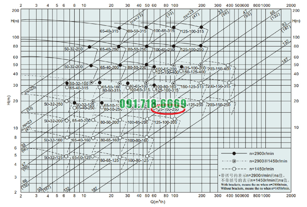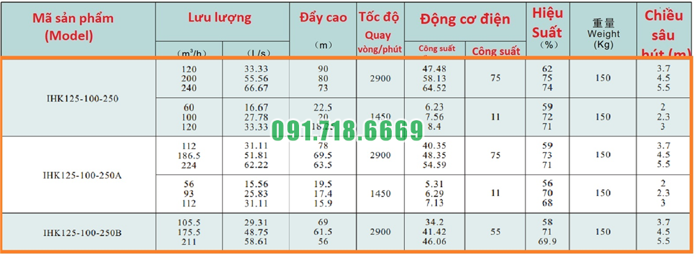 Bảng lưu lượng của máy bơm nước cánh hở IHK125-100-250 động cơ điện 75 kw