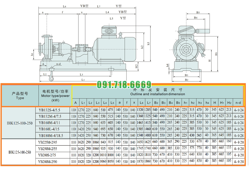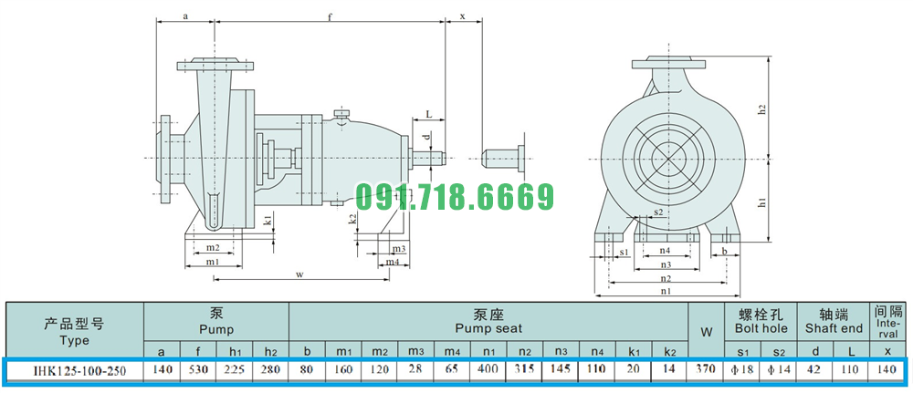 Kích thước của đầu máy bơm nước cánh hở IHK125-100-250 động cơ điện 75 kw