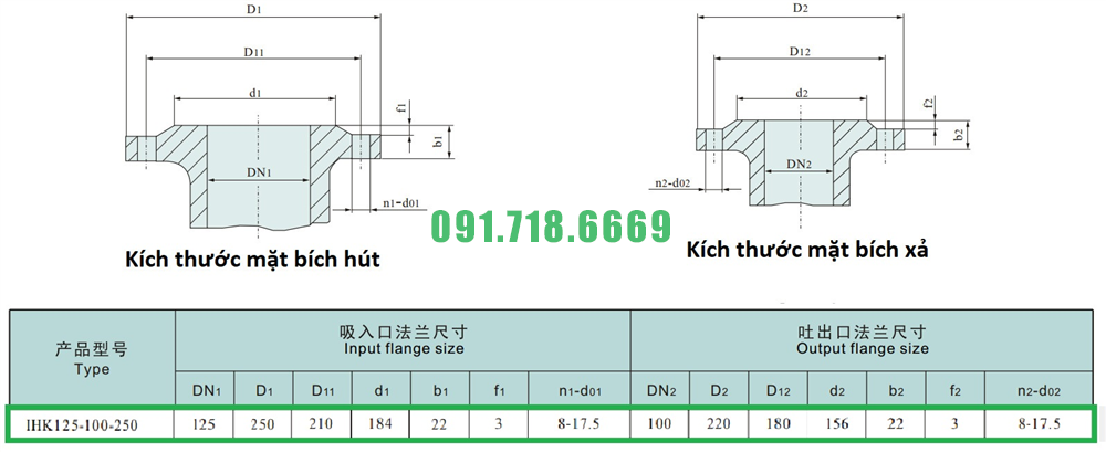 Kích thước mặt bích của máy bơm nước cánh hở IHK125-100-250 động cơ điện 75 kw