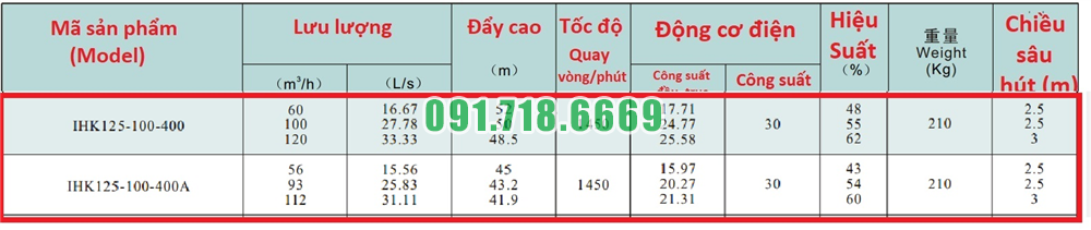 Bảng lưu lượng của máy bơm nước cánh hở IHK125-100-400 kích thước 100 mm