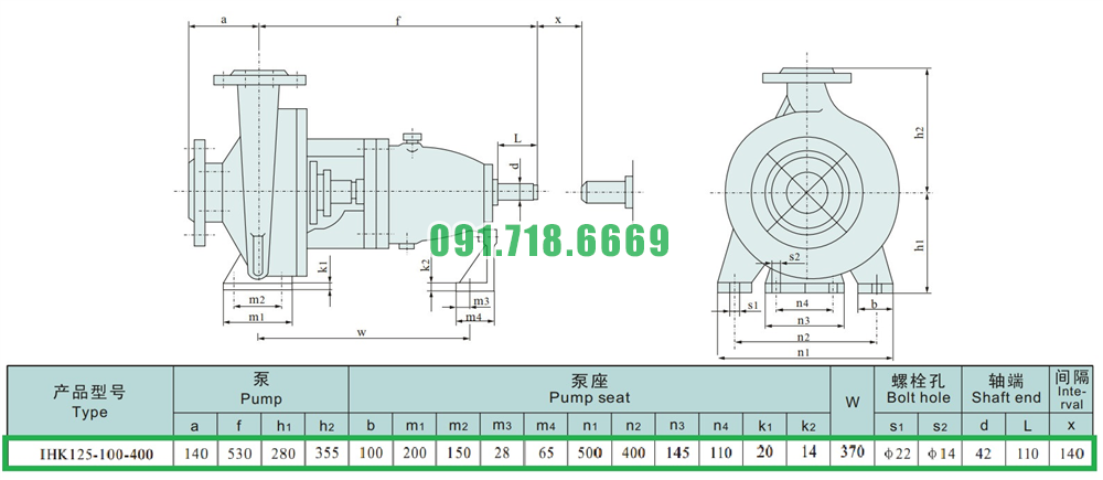 Kích thước của đầu máy bơm nước cánh hở IHK125-100-400 kích thước 100 mm