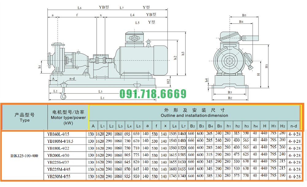 Kích thước lắp đặt của máy bơm nước cánh hở IHK125-100-400 kích thước 100 mm