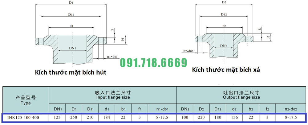 Kích thước mặt bích của máy bơm nước cánh hở IHK125-100-400 kích thước 100 mm