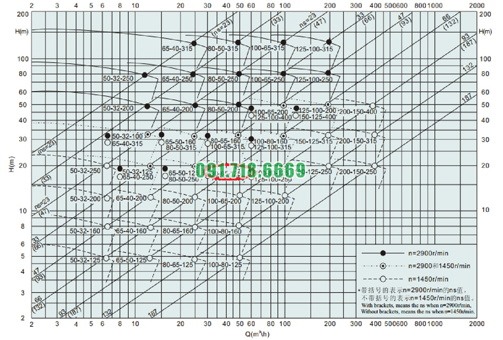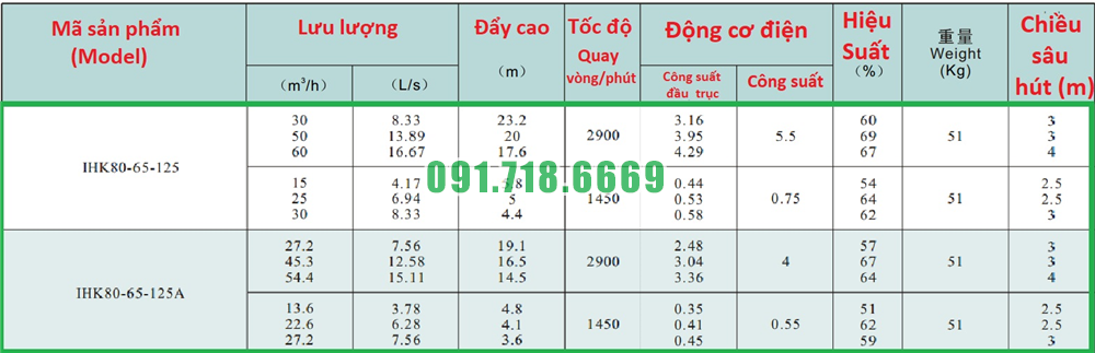 Bảng lưu lượng của máy bơm nước cánh hở IHK80-65-125 hiệu suất 60 m3/h