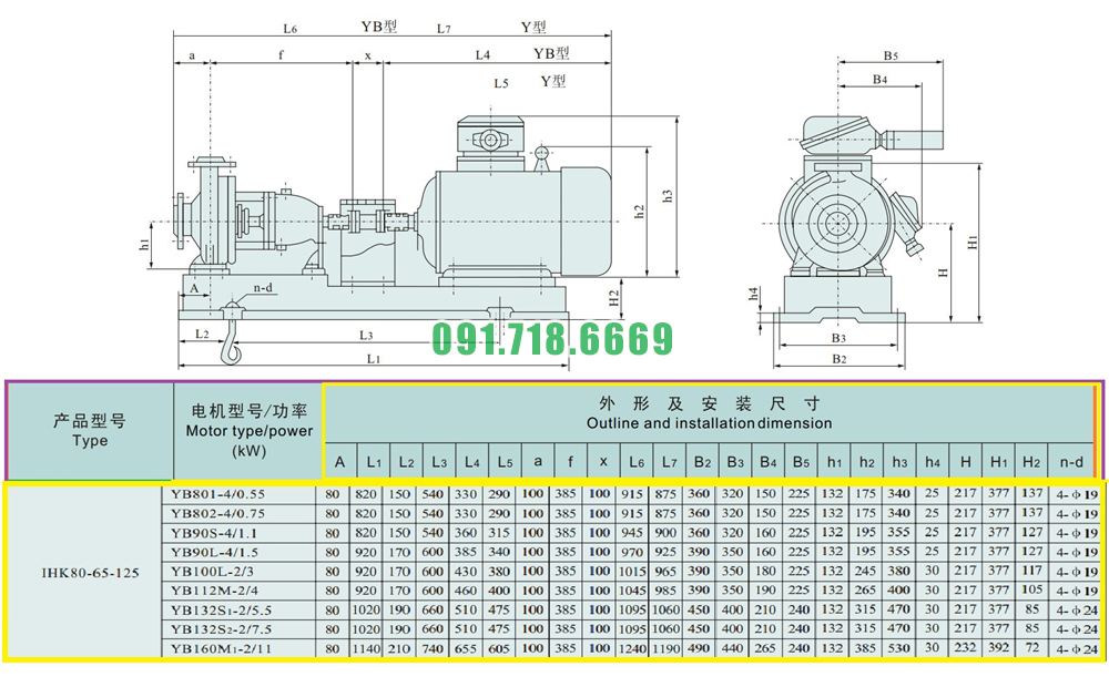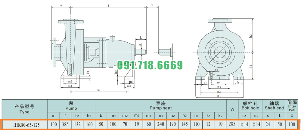 Kích thước của đầu máy bơm nước cánh hở IHK80-65-125 hiệu suất 60 m3/h