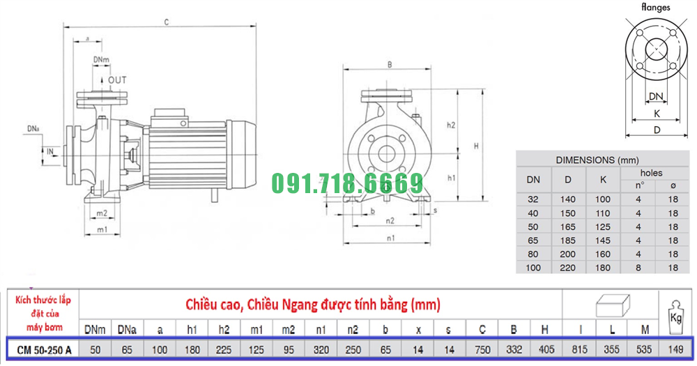 Kích thước máy bơm nước li tâm CM50-250A động cơ điện 22 kw