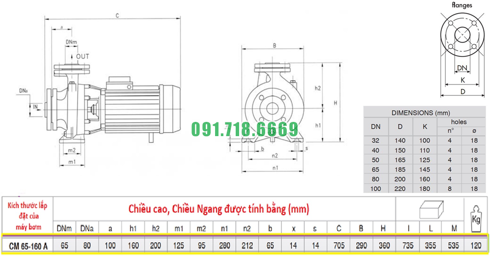 Kích thước máy bơm nước li tâm CM65-160A vỏ bằng gang
