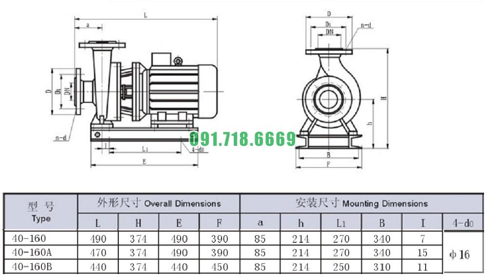 Bản vẽ cấu tạo và kích thước bơm li tâm trục ngang SLW-ISW40-160 đẩy cao 33m và hút sâu 2.3m