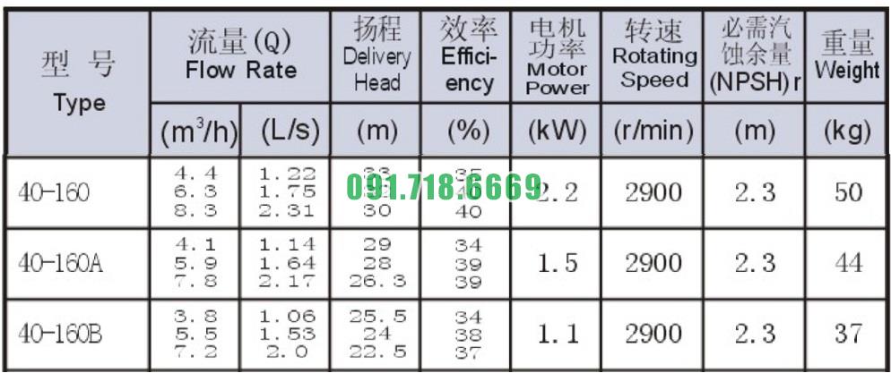 Bảng thông số kỹ thuật bơm li tâm trục ngang SLW-ISW40-160 đẩy cao 33m và hút sâu 2.3m