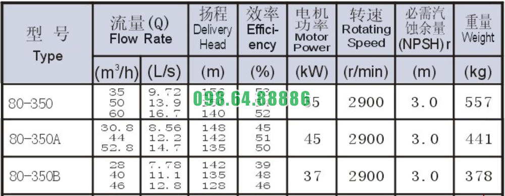 Bảng thông số kỹ thuật bơm li tâm trục ngang SLW80-ISW80-350 có động cơ 55 kw đẩy cao 156m