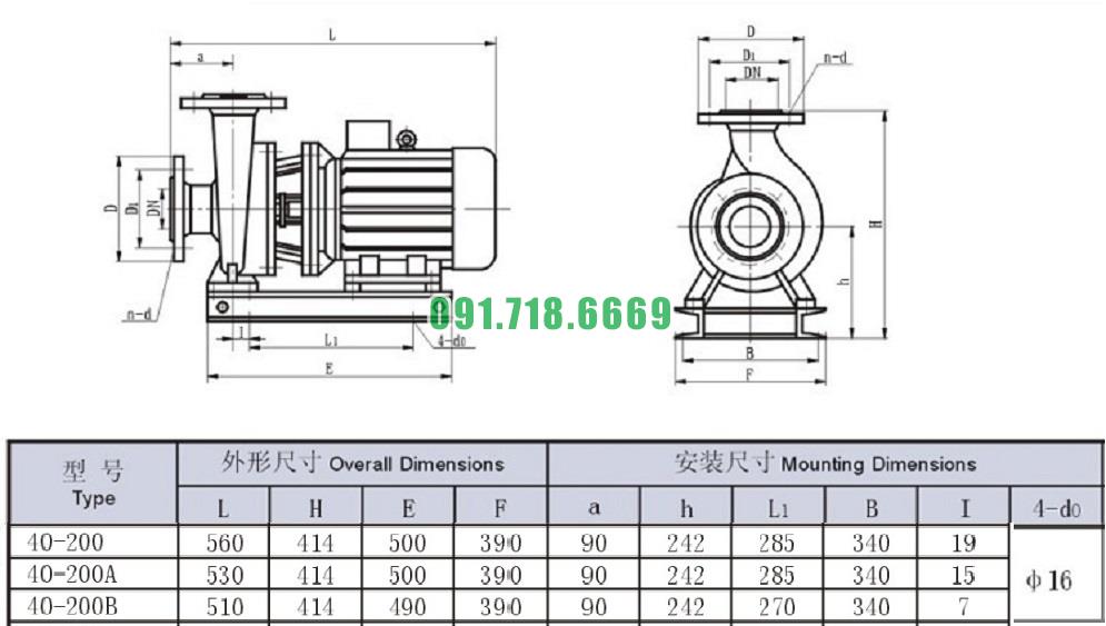 Bản vẽ cấu tạo và kích thước bơm nước li tâm trục ngang công suất 8.3 m3/h model SLW-ISW40-200