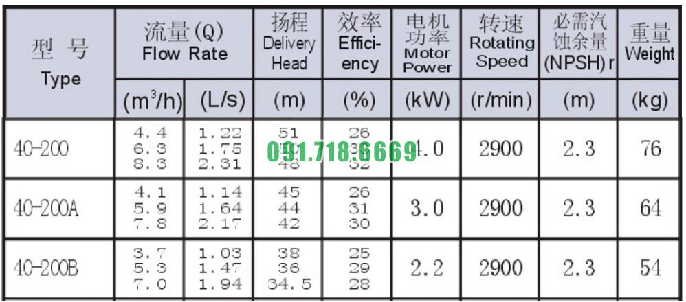 Bảng thông số kỹ thuật bơm nước li tâm trục ngang công suất 8.3 m3/h model SLW-ISW40-200