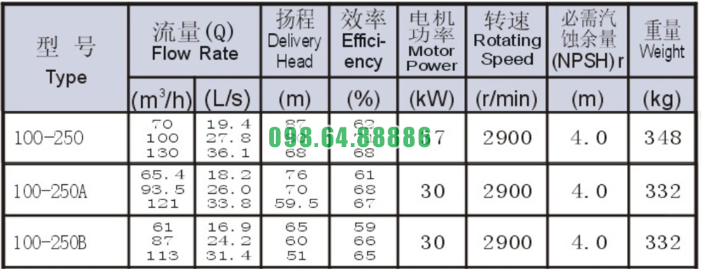 Bảng thông số kỹ thuật bơm nước li tâm trục ngang động cơ 37 kw SLW100-ISW100-250