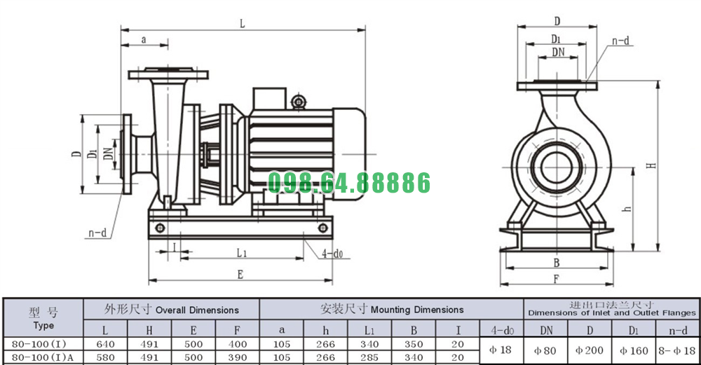 Bản vẽ cấu tạo và kích thước bơm nước li tâm trục ngang động cơ 5.5 kw SLW80-ISW80-100-I
