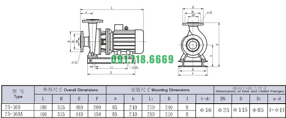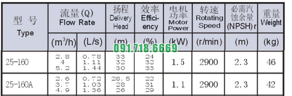 Bơm nước li tâm trục ngang ISW25-160 động cơ 1.5 kw lưu lượng max 5.2 m3/h