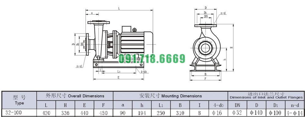Bản vẽ cấu tạo và kích thước bơm nước li tâm trục ngang ISW32-100