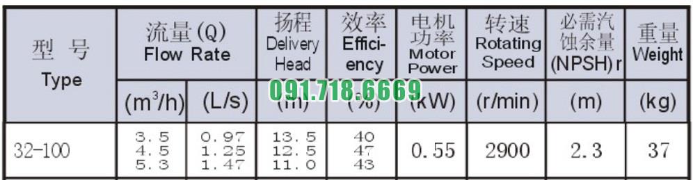 Bảng thông số kỹ thuật bơm nước li tâm trục ngang ISW32-100