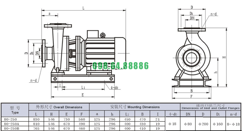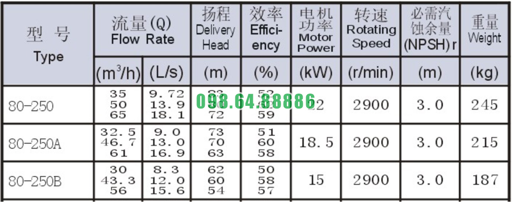 Bảng thông số kỹ thuật bơm nước nằm ngang mã SLW80-ISW80-250 động cơ 22 kw