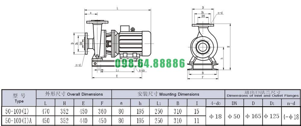 Bản vẽ cấu tạo và kích thước bơm nước nằm ngang SLW-ISW50-100-I lưu lượng từ 4.86 L/s - 9.03 L/s