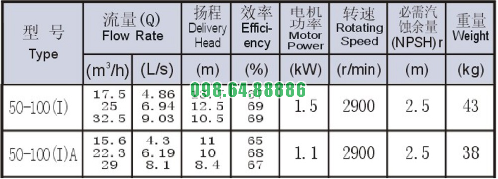 Bảng thông số kỹ thuật bơm nước nằm ngang SLW-ISW50-100-I lưu lượng từ 4.86 L/s - 9.03 L/s