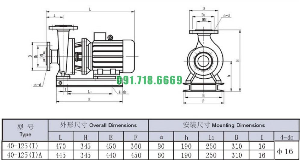 Bản vẽ cấu tạo và kích thước bơm nước trục ngang SLW-ISW40-125-I đẩy cao max 21.2m
