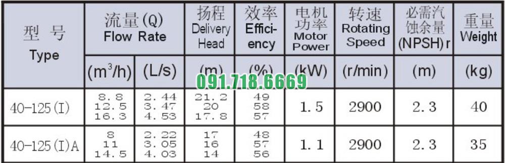Bảng thông số kỹ thuật bơm nước trục ngang SLW-ISW40-125-I đẩy cao max 21.2m