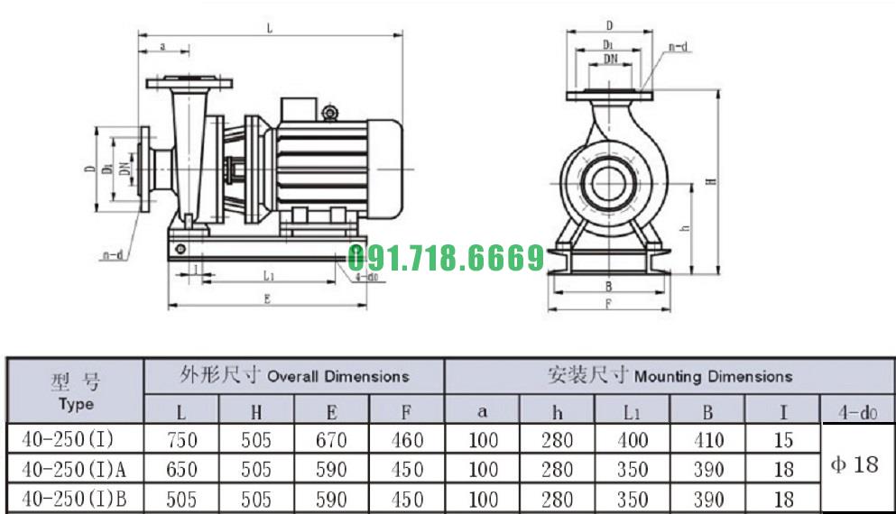 Bản vẽ cấu tạo và kích thước bơm nước trục ngang SLW-ISW40-250-I khối lượng 148 kg