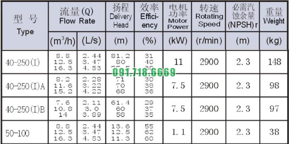 Bảng thông số kỹ thuật bơm nước trục ngang SLW-ISW40-250-I khối lượng 148 kg