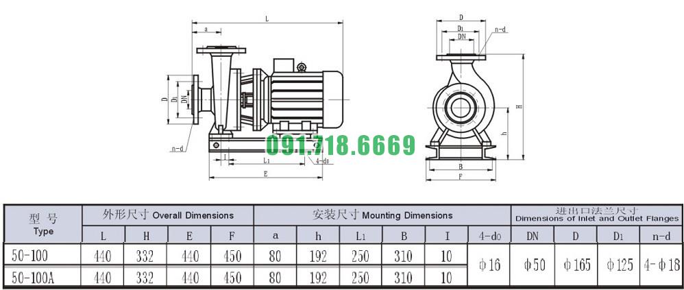 Bản vẽ cấu tạo và kích thước bơm nước trục ngang SLW-ISW50-100 khối lượng 38 kg