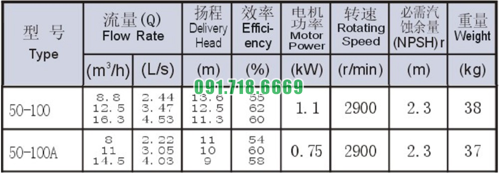 Bảng thông số kỹ thuật bơm nước trục ngang SLW-ISW50-100 khối lượng 38 kg