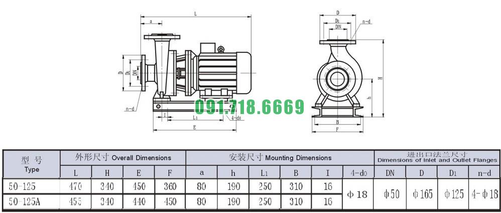 Bản vẽ cấu tạo và kích thước bơm nước trục ngang SLW-ISW50-125 khối lượng 44 kg