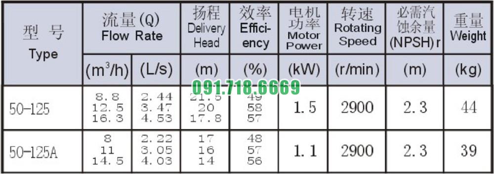 Bảng thông số kỹ thuật bơm nước trục ngang SLW-ISW50-125 khối lượng 44 kg