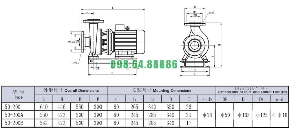 Bản vẽ cấu tạo và kích thước bơm nước trục ngang SLW-ISW50-200 động cơ 5.5 kw