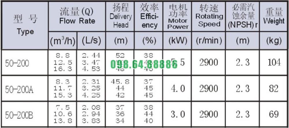 Bảng thông số kỹ thuật bơm nước trục ngang SLW-ISW50-200 động cơ 5.5 kw