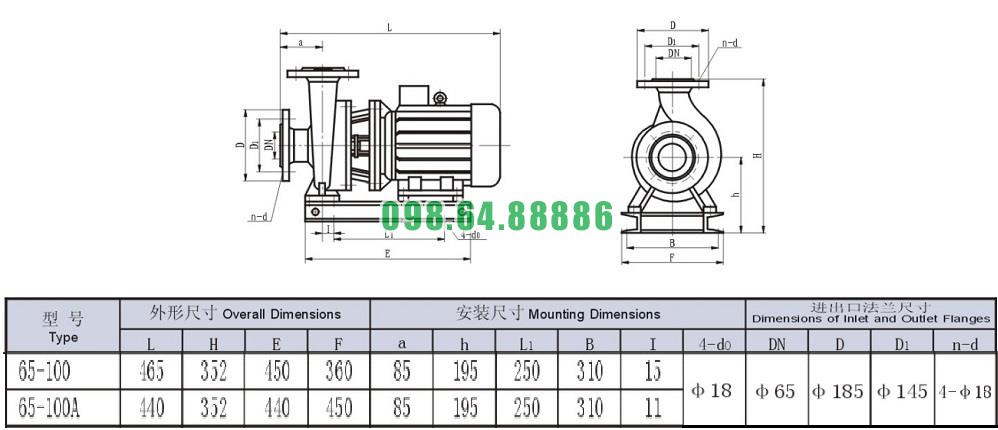 Bản vẽ cấu tạo và kích thước bơm nước trục ngang SLW-ISW65-100 lưu lượng 9.03 L/s