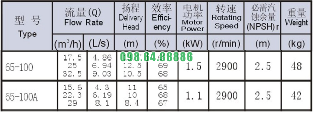 Bảng thông số kỹ thuật bơm nước trục ngang SLW-ISW65-100 lưu lượng 9.03 L/s