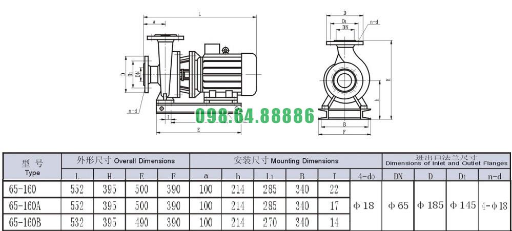 Bản vẽ cấu tạo và kích thước bơm nước trục ngang SLW-ISW65-160 lưu lượng 9.03 L/s