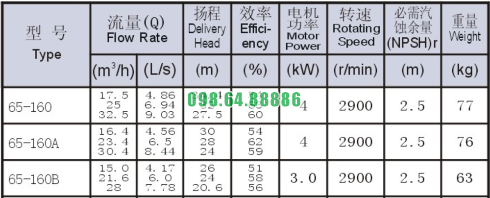 Bảng thông số kỹ thuật bơm nước trục ngang SLW-ISW65-160 lưu lượng 9.03 L/s