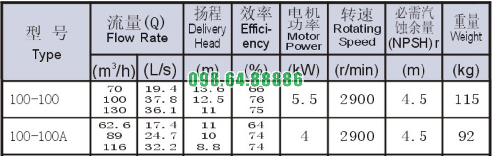 Bảng thông số kỹ thuật bơm nước trục ngang SLW100-ISW100-100 hút sâu 4.5m