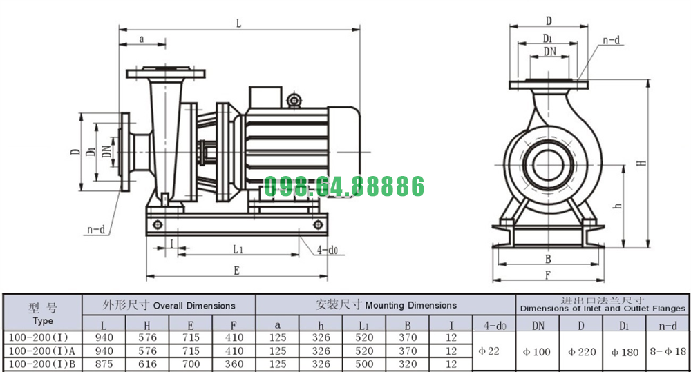 Bản vẽ cấu tạo và kích thước bơm nước trục ngang SLW100-ISW100-200-I hút sâu 4.0m