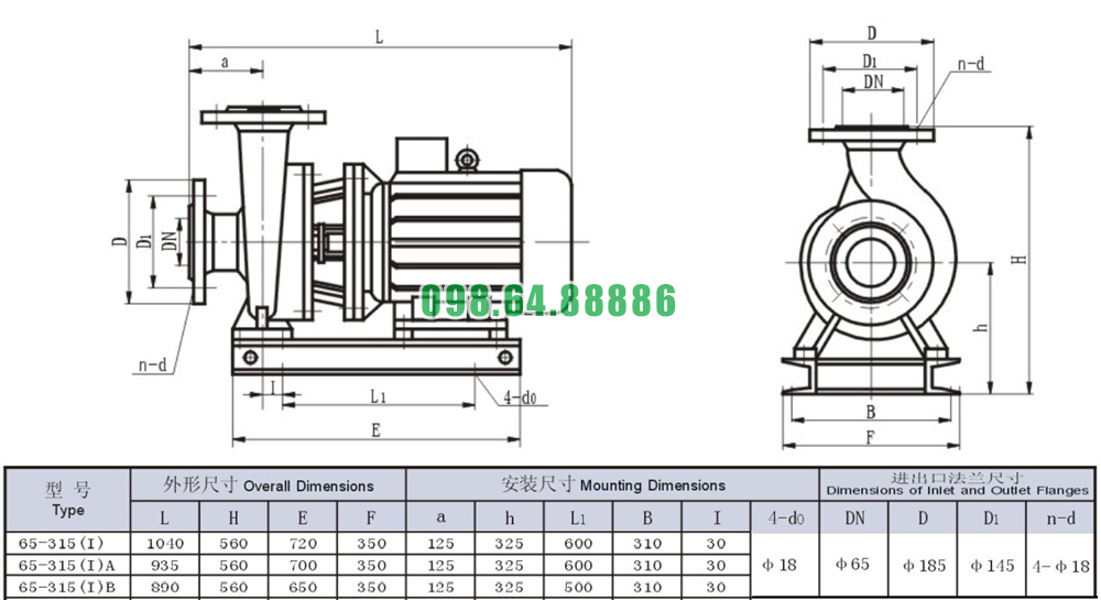 Bản vẽ cấu tạo và kích thước bơm nước trục ngang SLW65-ISW65-315-I hiệu năng 57%