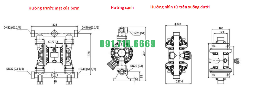 Bản vẽ kích thước của máy bơm màng QBY3-40STFF hút sâu 5m