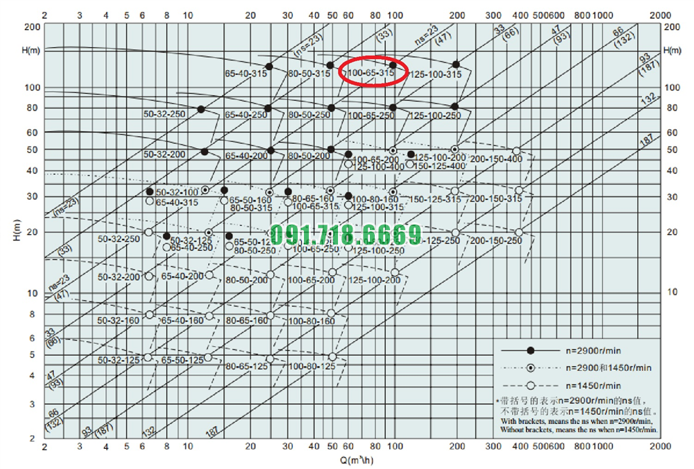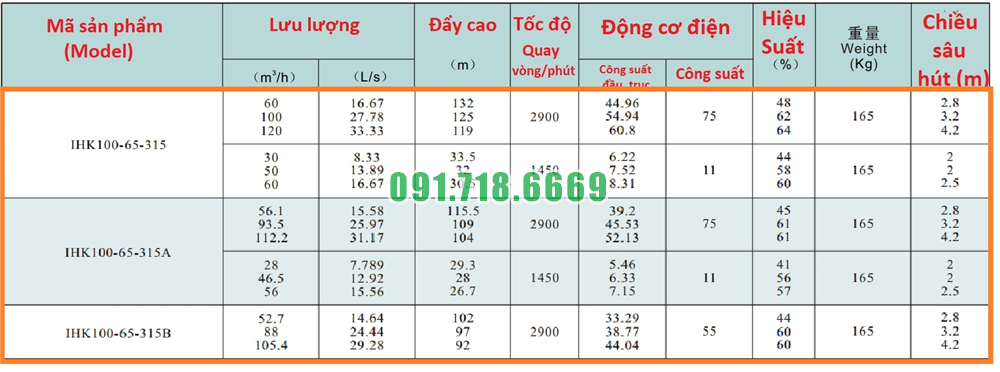 Bảng lưu lượng của bơm li tâm cánh hở đường thoát đầu vào ra Dn100 model IHK100-65-315